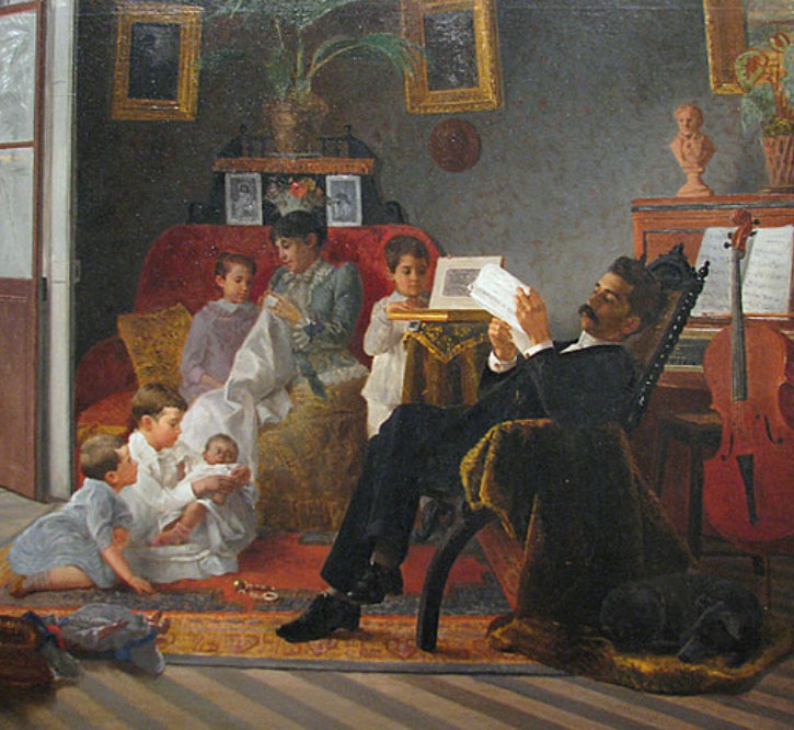 O modelo de mulher ideal naquele período era o da rainha do lar, preocupada com a saúde do marido e a educação dos filhos – Cena da família de Adolfo Augusto Pinho (quadro de José Ferraz de Almeida Júnior, 1891).