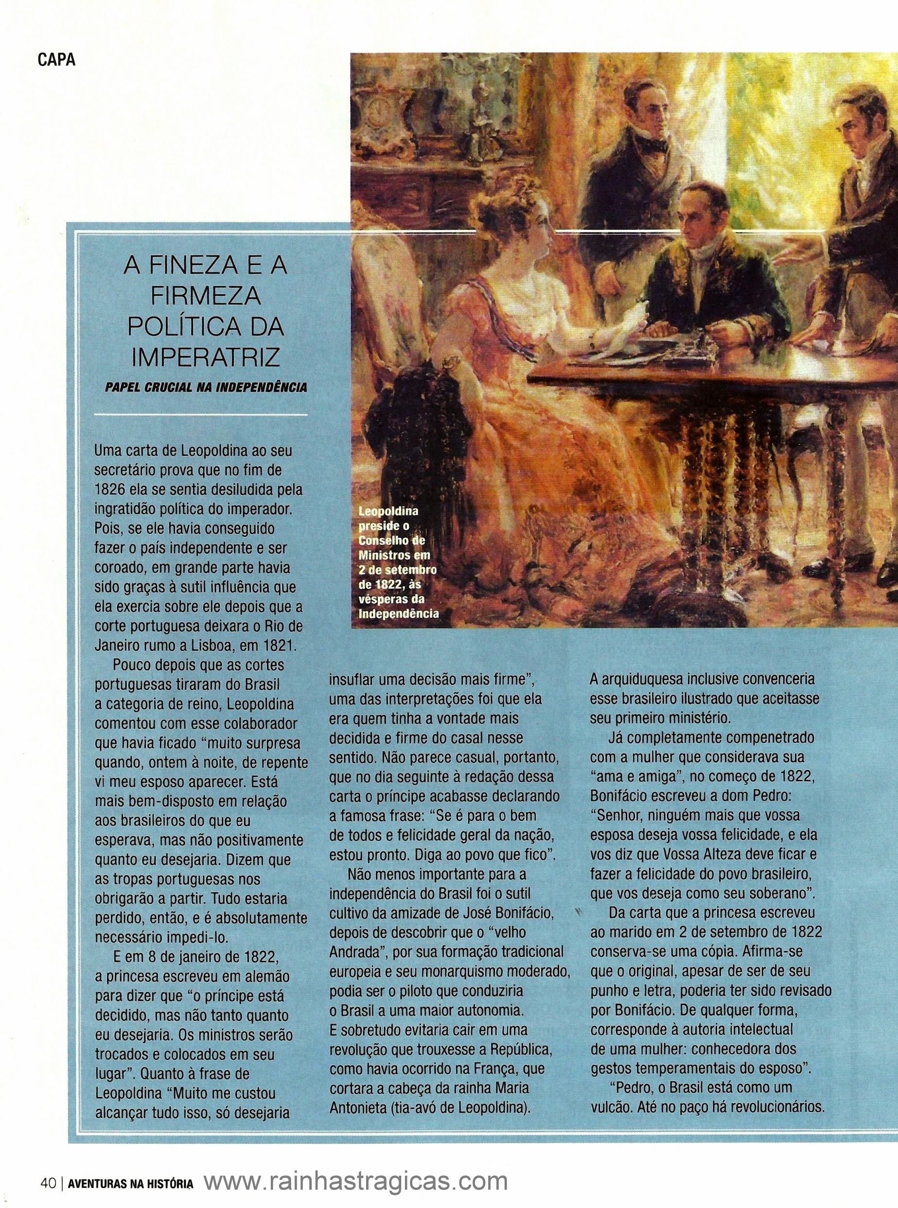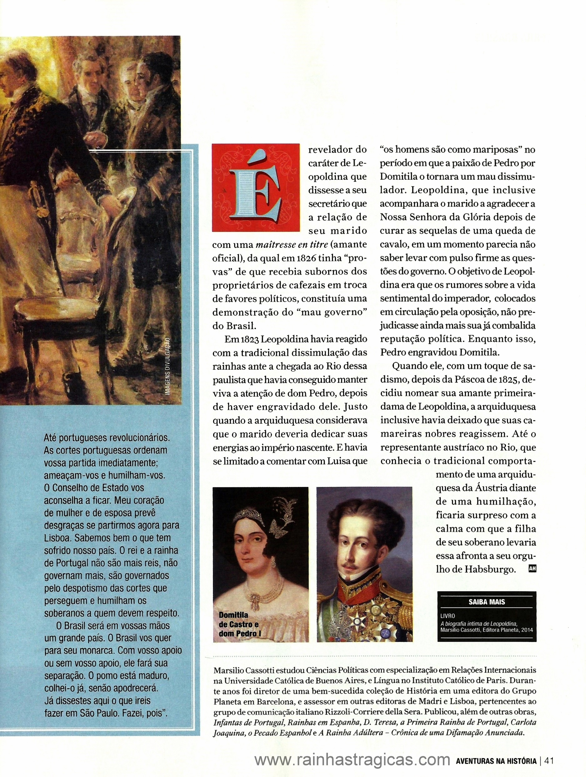 Intitulada “Amor e poder nos tempos do império”, a matéria é composta de 10 páginas, ricamente ilustradas com retratos e documentos ligados à D. Leopoldina. O estilo de escrita de Cassotti é bastante leve e bem acessível ao público. No texto, ele revela os dissabores enfrentados pela soberana no seio de sua nova família portuguesa e sua fundamental contribuição para a emancipação política do Brasil. Não obstante, o autor traz alguns detalhes da pesquisa para seu novo livro e como ele partiu de uma extensiva análise documental para trazer ao público a “real” Leopoldina, uma mulher com defeitos e virtudes, que amou o Brasil como se brasileira fosse e lutou pela felicidade da Nação e de seu povo. Em breve, publicaremos no Rainha Trágicas um resenha do livro de Marsillo Cassotti, “A biografia íntima de Leopoldina” (2015). Até lá, fiquem com os scans em boa qualidade da matéria “Amor e poder nos tempos do império”, publicada pela revista Aventuras na História.