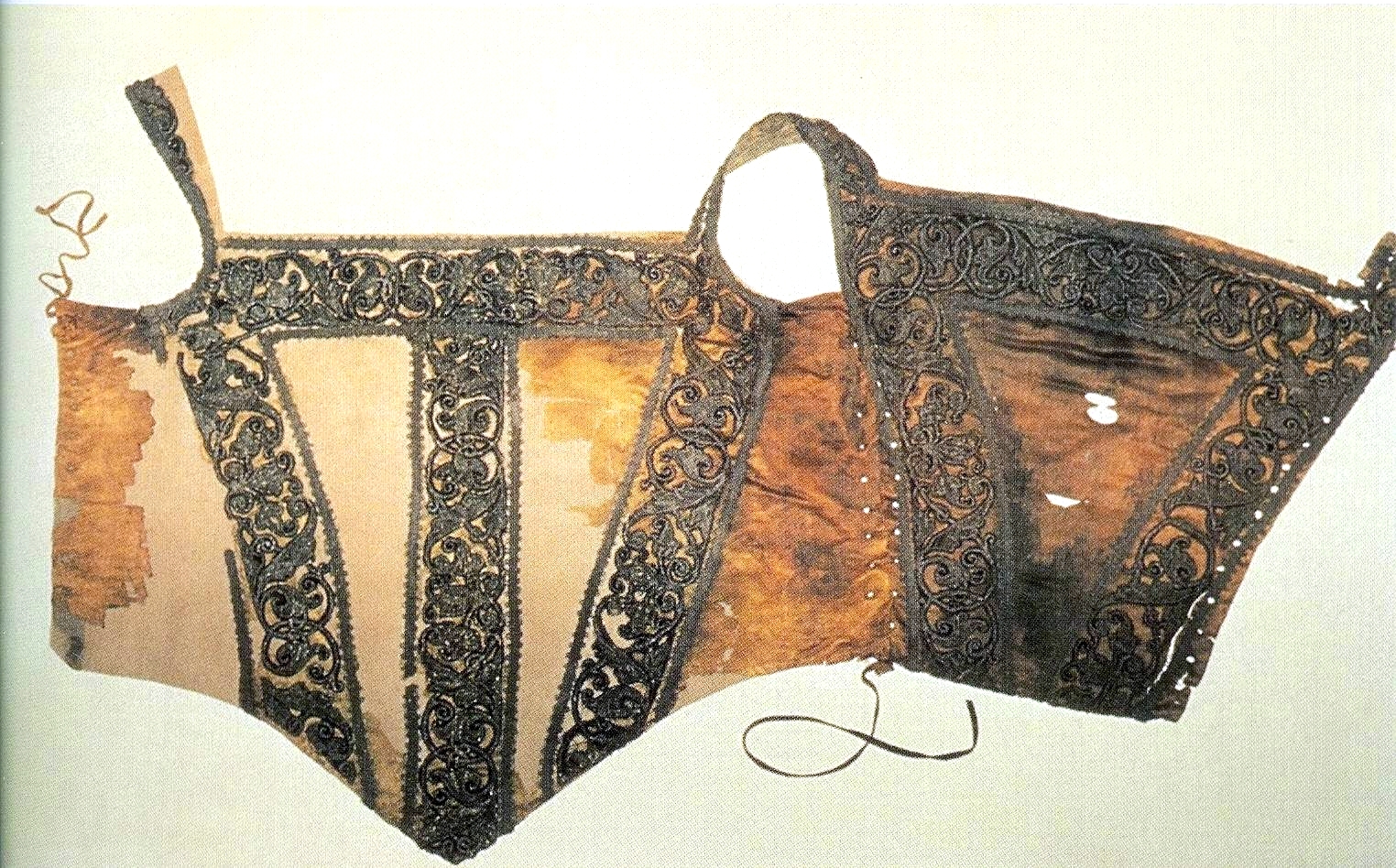Detalhe da estampa do vestido que Eleonora de Toledo usado em seu retrato. O tecido, já bastante desgastado pelo tempo, é adornado por arabescos de veludo preto sobre cetim branco. O brocado de ouro foi removido.