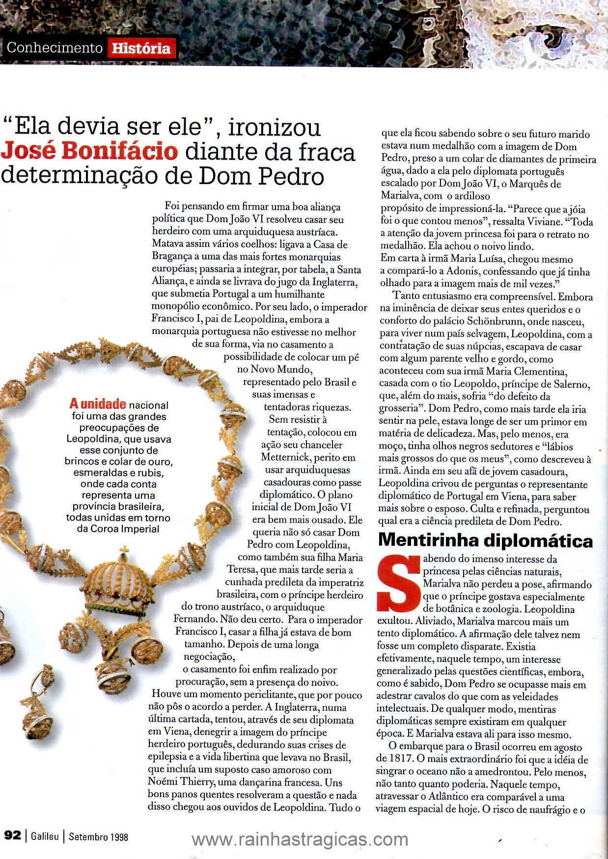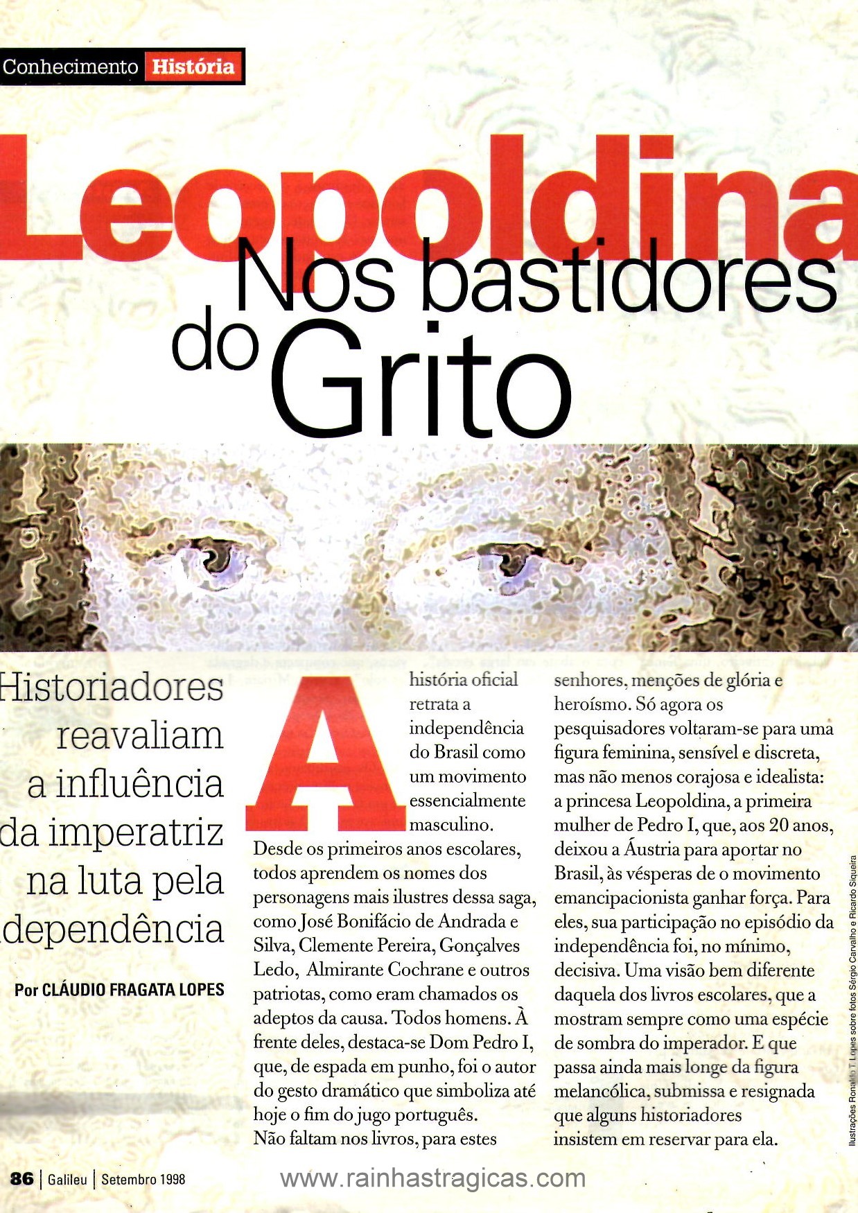 A matéria, escrita por Cláudio Fragata Soares, é composto de 11 páginas acompanhadas de ilustrações que remetem à vida da soberana. Segundo o autor, “pouca gente sabe que era Leopoldina quem ocupava a regência do Brasil quando Pedro I fez sua famosa viagem à província de São Paulo, em 1822, e que culminou com a proclamação da independência no dia 7 de setembro” (1998, p. 88). O texto ainda acompanha transcrição de alguns documentos que atestam a participação da imperatriz na emancipação política do país, como a carta que ela enviara ao marido em 2 de setembro com o profético trecho: “O Brasil vos quer para seu monarca. Com o vosso apoio ou sem o vosso apoio ele fará a sua separação. O pomo está maduro, colhei-o já, senão apodrece”. Além disso, encontramos a opinião de alguns historiadores, como Viviane Tessitore. pesquisadora de Leopoldina.