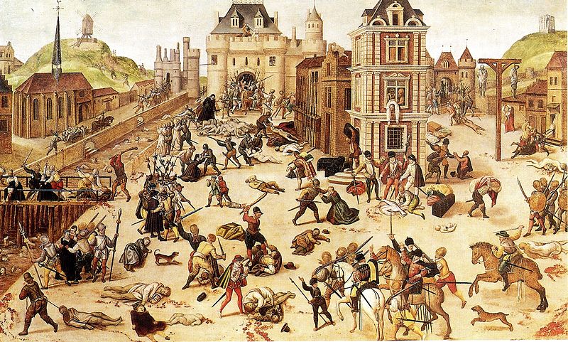 Ilustração do artista protestante François Dubois, retratando o Massacre de São Bartolomeu. No canto superior esquerdo da imagem, é possível ver Catarina de Médicis, trajada de preto, contemplando a carnificina., numa clara intensão do artista em associa-la ao evento.