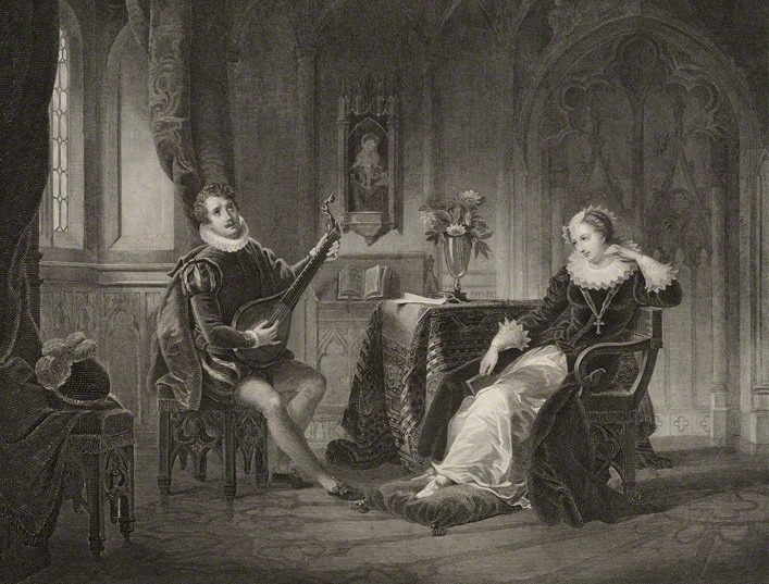 NPG D25070; Pierre de Bocosel de Chatelard or Chastelard playing the lute to Mary, Queen of Scots by Andrew Duncan, after Henri Jean-Baptiste Victoire Fradelle Publicado outubro 12, 2016 at 707 × 537 in As propriedades curativas da música, nas vidas de Ana Bolena, Mary Stuart e Elizabeth I – Parte II ← Anterior Próxima → Litografia representando David Rizzio tocando para Mary Stuart, por Andrew Duncan, 1830.