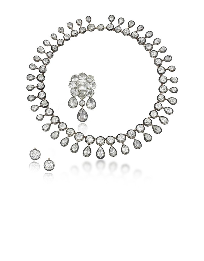 Um conjunto composto por 95 diamantes, incluindo cinco diamantes que pertenceram a Maria Antonieta, rainha de França. Feita pora Luísa de França, neta de Carlos X, rei da França e mãe de Roberto I, Duque de Parma. Estimado entre US $ 300.000 e 500.000. Destaque no Royal Jewels do leilão da família Bourbon-Parma na Sotheby’s Geneva, em novembro de 2018.