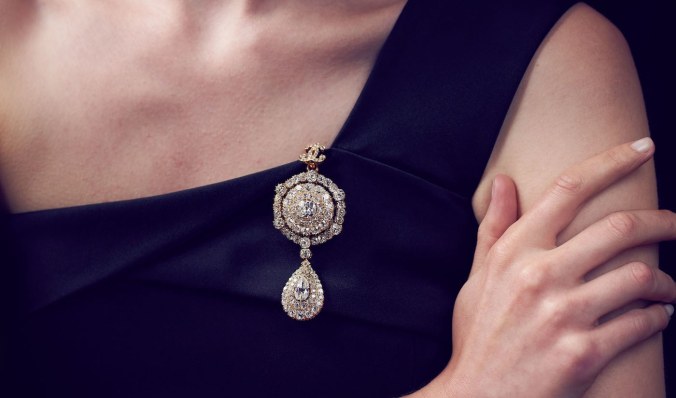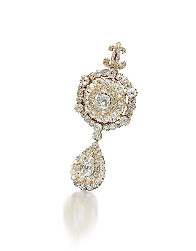 Um broche de diamante com pendante, dado a Princesa Maria Pia de Bourbon-Duas Sicílias, pelo avô de seu marido, Carlos II de Parma, por ocasião de seu casamento com Robert I. Estimado US $ 25.000 – 35.000. Destaque no Royal Jewels do leilão da família Bourbon-Parma na Sotheby’s Geneva, em novembro de 2018.