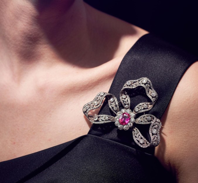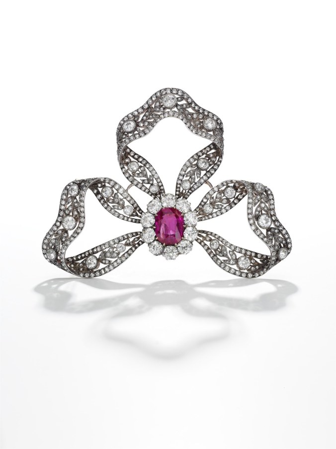 Um broche de arco de diamante com um rubi birmanês de 6,89 quilates, dado à arquiduquesa Maria Anna da Áustria por seu pai para marcar o nascimento de seus dois filhos. Estimava entre US $ 200 mil e US $ 300 mil. Destaque no Royal Jewels do leilão da família Bourbon-Parma na Sotheby’s Geneva, em novembro de 2018.