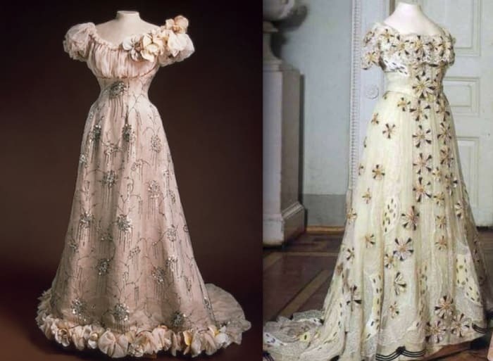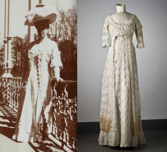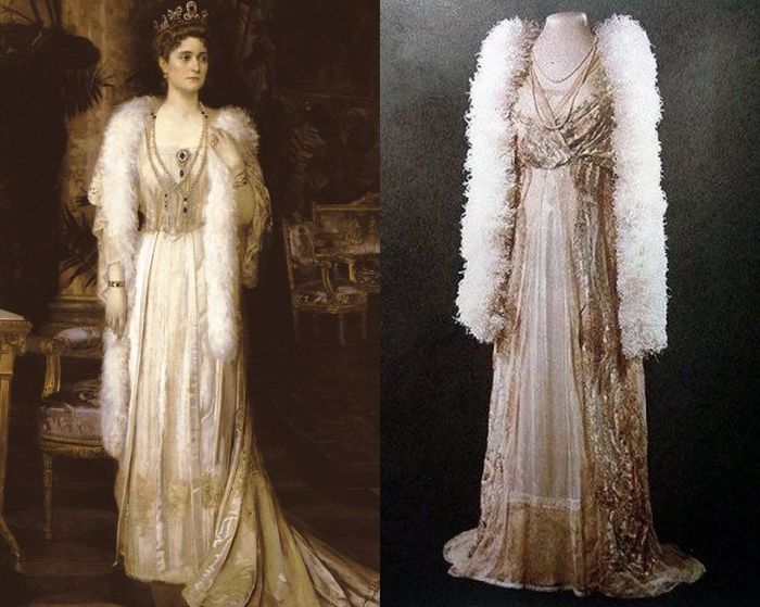 Esse era um dos vestido favoritos da czarina Alexandra Feodorovna da Rússia. Ela foi retrata usando a peça pelo pintor Nikolai Kornilievich Bodarevsky (esquerda), em 1907.