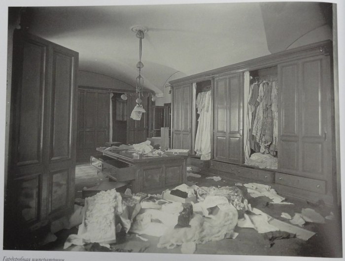 Fotografia tirada em novembro de 1917, mostrando a pilhagem do guarda-roupas da imperatriz, no palácio de Inverno!