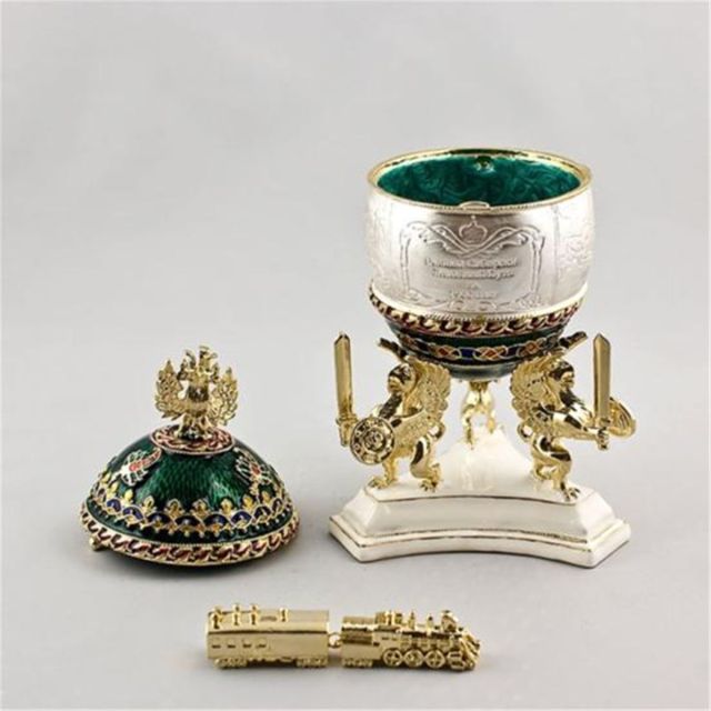 No caso dos famosos ovos de páscoa da família imperial russa, o czar confiava a escolha dos materiais e o design da peça inteiramente ao joalheiro. Desde que Alexandre III lhe encomendara o primeiro destes itens em 1885, a ideia de Fabergé era utilizar o formato do avo como uma casca que se abria, para revelar um presente escondido, que podia ser de natureza bem variada: de uma galinha empoleirada num ninho de diamantes, a uma cesta de flores silvestres com folhas de ouro. No alto do ovo podia sair também um galo a ritmos compassados, cantando e batendo as asas para marcar o horário. A cada ano, o joalheiro procurava se superar em beleza e genialidade. Em 1900, por exemplo, ele criou um ovo de esmalte azul, verde e amarelo, contendo delicadas incrustações de prata na casca com o desenho do mapa da Sibéria e a rota da Grande Ferrovia Siberiana. Uma vez aberto com um simples toque na águia bifurcada presente no topo da joia, ela revelava uma miniatura de 30 cm de cumprimento por 1,5 cm de largura dos cinco vagões e locomotiva da Transiberiana. “Manivela de direção, engrenagens duplas sob os vagões e outras partes móveis eram feitas com precisão, de modo que bastava dar voltas numa pequena chave de ouro… a locomotiva de ouro e platina, com um rubi brilhando no farol, realmente puxava o trem”, descreveu um observador (MASSIE, 2014, p. 194).