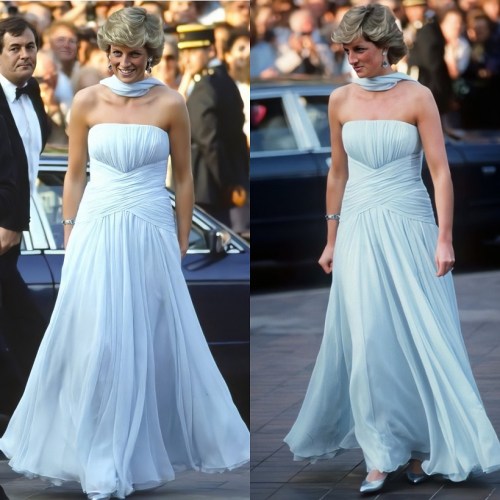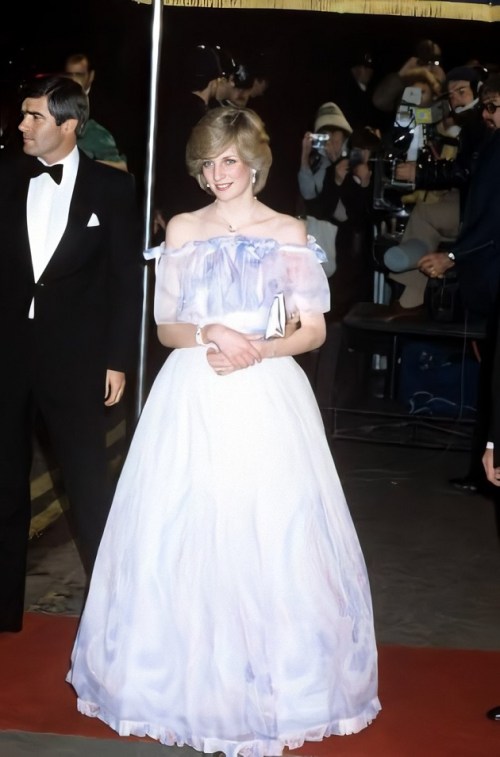 A primeira vez em que princesa de Gales chamou a atenção das lentes dos fotógrafos para a suas roupas foi quando ela ainda era Lady Diana Spencer. A futura esposa do príncipe Charles usou um longo preto sem alças, desenhado por Elizabeth e David Emanuel, durante a sua primeira aparição em um evento público ao lado do noivo, no Goldsmith’s Hall, no início de 1981. Quando observou o trajes que sua noiva estava usando, Charles a advertiu de que a roupa era inadequada para o evento, uma vez que o preto era usado pela realeza apenas em ocasiões de luto. “Mas eu ainda não faço parte de sua família”, foi o que Diana lhe respondeu diante da crítica. Ela escolheu o modelo em preto por considera-la uma cor mais elegante e jovial. Além disso, o vestido realçava o seu busto e valorizava sua cintura. Na mesma noite, ela conheceu Grace Kelly, princesa de Mônaco. As duas tiraram várias fotos juntas. Conforme Diana se recordou anos depois, ela estava bastante confusa naquele dia, sem saber ao certo de que lado usar a bolsa ou por qual porta entrar. Quando Grace percebeu sua insegurança diante de tantos olhares e lentes, a ex-estrela de Holywood lhe disse: “Não se preocupe, vai ficar pior”. Grace morreria um ano depois, em um trágico acidente de carro.