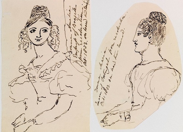 Desenhos que a princesa Vitória de Kent fez da duquesa Amélia e de Dona Maria II, em outubro de 1833 (Royal Collection Trust).