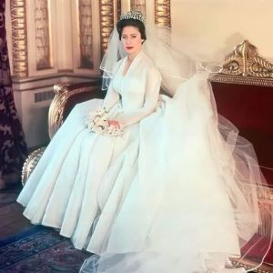 Margaret vestida de noiva para seu casamento, no dia 6 de maio de 1960.