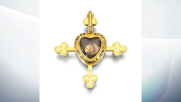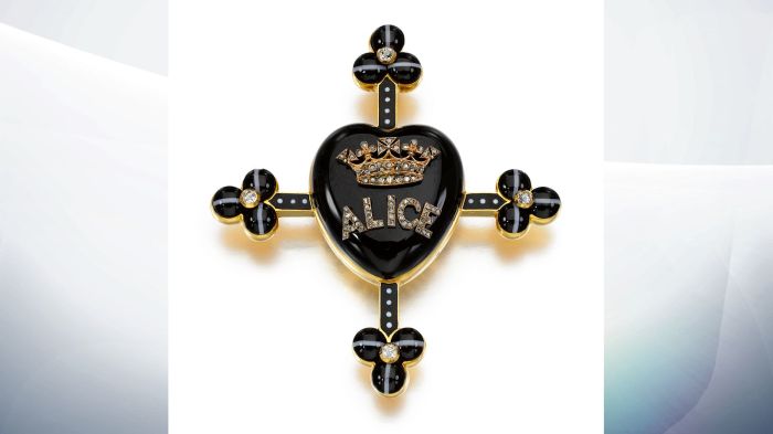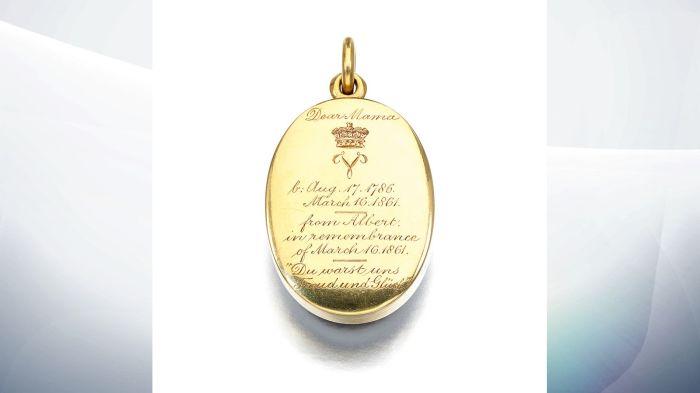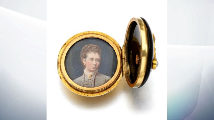 Com efeito, alguns desses artefatos ligados ao luto da soberana serão leiloados 120 anos após sua morte. Eles foram transmitidos pelos descendentes de Vitória e agora podem ser admirados pelo público pela primeira vez em décadas. As joias revelam um “lado íntimo” da monarca, principalmente por terem sido utilizados como uma forma de consolo por ela após a perda de três de seus nove filhos, de seu marido e sua mãe. Ela acreditava estar mais perto dos seus entes amados, mantendo um pequeno “pedaço” de cada um deles junto a si. As joias que serão leiloadas pela Sotheby no dia 24 de março de 2021 são compostas de um botão, um broche e pingentes, desenhados especialmente para abrigar os retratos e mechas de cabeço da duquesa de Kent e da princesa Alice. Essa última, por sua vez, é bisavó do príncipe Philip, marido da atual rainha, Elizabeth II.