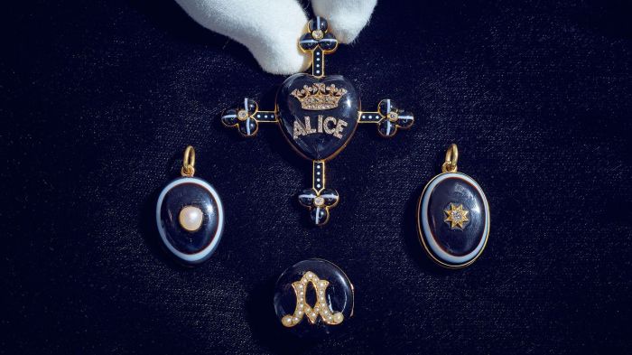 Segundo David Macdonald, especialista da Sotheby e mestre do leilão, os mementos da rainha rainha Vitória “são quase de outro nível”, por sua característica biográfica. “Você pensa em Vitória e imagina as grandes joias de estado, os diamantes, o Koh-i-Noor, todas essas pedras. Essas joias são muito mais íntimas, seu valor não se dá através de grandes diamantes… está na expressão plena, uma expressão emocional e profundamente pessoal sobre a perda e o amor”, disse David. As peças foram herdadas pela neta da rainha, a princesa Victoria de Hesse, filha da princesa Alice. A partir de então, permaneceram entre os seus seus descendentes através de gerações até chegarem às mãos de Patricia Knatchbull, 2ª condessa Mountbatten da Birmânia (trineta da rainha Vitória). Elas teriam sido encontradas “na gaveta de uma casa de família” e estão sendo leiloadas junto a outros bens da condessa.