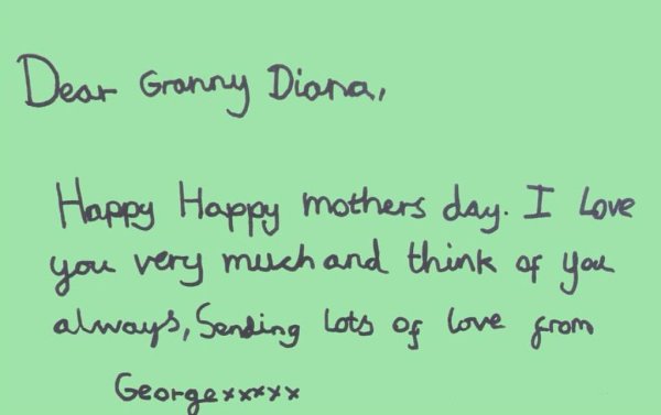 Acompanhado da legenda, o duque e a duquesa de Cambridge postaram as mensagens confeccionadas por seus três filhos para a falecida princesa de Gales. Além dos textos carinhosos, corações, flores, borboletas e pequenos animais foram aplicados aos cartões e depois pintados com cores alegres.