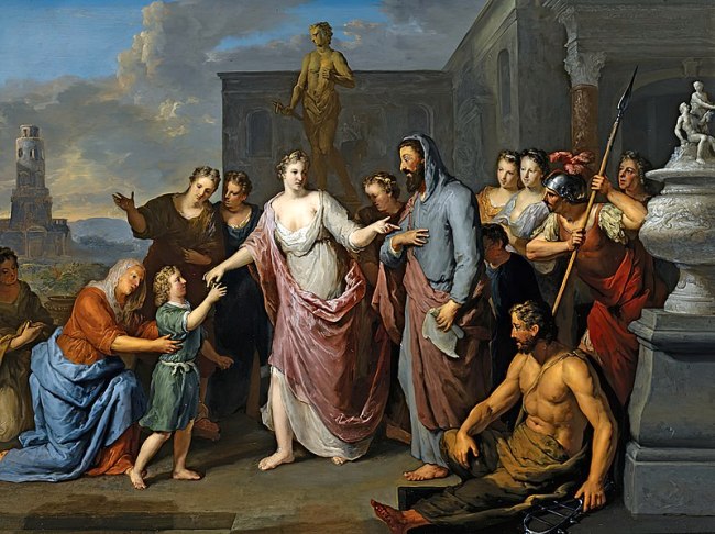 Olímpia apresenta seu jovem filho Alexandre, o Grande, a Aristóteles. Tela de Gerard Hoet, c. 1733.