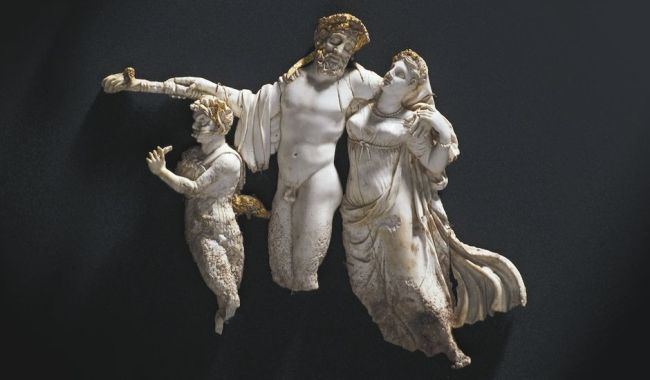Marfim da tumba III, em Vergina, possivelmente representando Filipe e Olímpia como deuses e o jovem Alexandre como Pã.