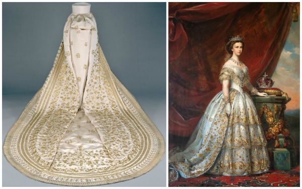 Até hoje, alguns especialistas se debatem sobre a cor exata do vestido, uma vez que o modelo original não sobreviveu e as fotografias do período não permitem discernir corretamente se a seda seria branca, marfim ou azul-bebê. O acabamento da peça segue a moda tradicional húngara do século XV, com uma espécie de avental franzido na saia. Ao longo dos anos, cada pintor atribuiu uma característica extra à roupa, de modo que as réplicas existentes em museus são releituras aproximadas e não fidedignas. Outro exemplo é o vestido de casamento da soberana, usado em agosto de 1853. Nesse caso, não existem imagens contemporâneas do modelo. Então, só podemos imaginar como ele seria com base nas ilustrações póstumas e nas partes sobreviventes do tecido. Seguindo o costume da época, Sissi o doou para a Igreja após a cerimônia. O bordado de prata com guirlandas de flores foi recortado para a confecção de um manto sacerdotal. A peça pode ser vista atualmente no Sisi Museum, em Viena. Há também a cauda de seda branca, bordada em ouro. Concebida como uma parte independente do vestido de noiva, ela foi guardada pela filha da imperatriz, Maria Valéria, e em 1989 foi vendida por seus descendentes para o Kunsthistorisches Museum.