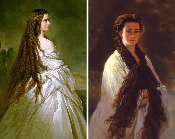 Voltando agora para o célebre quadro pintado por Winterhalter, ele foi encomendado pelo imperador Francisco José para fazer par com um retrato do próprio monarca. Existem ainda outras telas da soberana assinadas pelo artista, com apelo mais informal. Fazendo uso do estilo romântico pelo qual seu trabalho ficou tão caracterizado, Winterhalter representou Elisabeth em trajes mais despojados e com uma expressão serena no rosto. O destaque da produção ficou para sua basta cabeleira castanha de fios longos e grossos, que chegavam aos seus pés. Depois de prontas, as duas telas foram penduradas no escritório do imperador. É bastante raro encontrar outras representações de Sissi com os cabelos soltos. Na maioria dos retratos, eles são trançados e enrolados no topo de sua cabeça, criando uma espécie de diadema natural, que era enfeitado com flores ou joias. O penteado de Elisabeth acabou se tornando sua “marca registrada”, reproduzido em uma série de periódicos de moda como o Les Modes Parisiennes. Na sua edição de abril, o Godey’s Mgazine batizou o arranjo em forma de cocar com o nome de “imperatriz”, recomentando às suas leitoras que o decorassem com lilases persas brancos e/ou miosótis azuis. Como nem todas as mulheres do período tinham essa quantidade de cachos para fazer o penteado, elas geralmente recorriam ao uso de apliques.