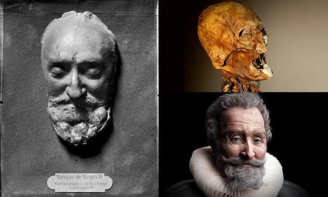 Fotografia da máscara mortuária do rei Henrique IV, feita a partir de seu corpo mumificado em 1793 (Bibliothèque Sainte-Geneviève). Ao lado, uma imagem recente da suposta cabeça do monarca e outra de sua reconstrução facial, feita em 2010.