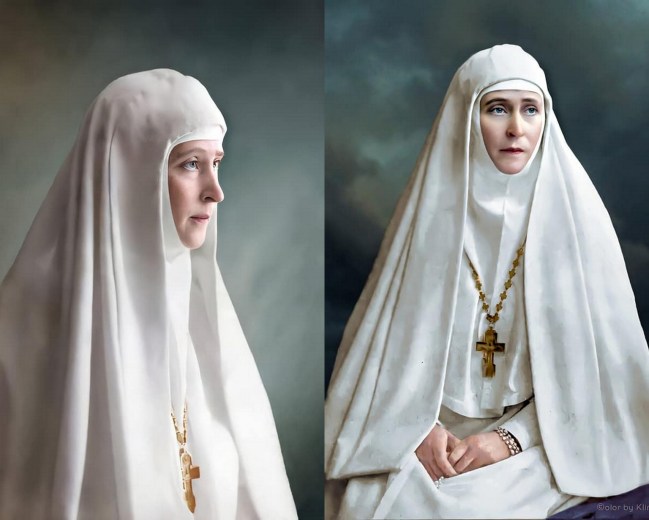 O assassinato do marido mudou a vida de Ella. A moça alegre, irrepreensível, que havia guiado a irmãzinha órfã de mãe, Alix, que havia rejeitado as atenções de Guilherme II, que havia esquiado e dançado com o czarevich Nicolau, essa mulher desapareceu. Todas as qualidades de gentileza e santidade insinuadas na calma aceitação do caráter de seu marido tomaram a frente com força total. Poucos anos depois, a grã-duquesa construiu uma abadia em Moscou, o Convento de Maria e Marta, e se tornou abadessa. Num último gesto de elegância mundana, encomendou ao pintor religioso Miguel Nesterov, muito em moda na época, o desenho dos hábitos para a ordem. Ele desenhou uma longa túnica com capuz de fina lã cinza-pérola e véu branco, que ela usou pelo resto da vida (MASSIE, 2014, p. 123).