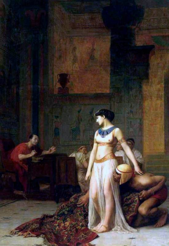 Tela pintada em 1866 pelo artista francês Jean-Léon Gérôme, atualmente parte de uma coleção privada. A obra retrata a cena, cristalizada no imaginário coletivo e pela literatura, do primeiro encontro com o cônsul e a rainha do Egito. A filha de Ptolomeu XII Auleta havia sido expulsa de Alexandria por seu irmão/esposo, Ptolomeu XIII Téo Filópator, com quem governava conjuntamente o país. Vagando pelo deserto durante meses, ela retornou à capital de forma incógnita para pedir ajuda a César. Cleópatra teria entrado em Alexandria enrolada em um tapete, carregado por um serviçal. A tela de Gérôme retrata justamente o momento em que a rainha se liberta do invólucro e apresenta sua beleza semidesnuda para César. Ela foi retratada como uma mulher branca, formosa e com os seios à mostra. A presença do serviçal egípcio ajoelhado ao seu lado, em quem a soberana apoia seu braço, ressalta o status elevado da personagem em relação ao povo de seu país. Já seus espectadores, estes são representados com expressões de surpresa em face da chegada inusitada da convidada.