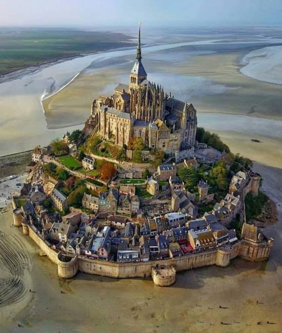 Belíssima visão do Monte Saint-Michel, na França, cidadela fortificada no século XIII e em cujo topo fica o santuário ao arcanjo São Miguel.