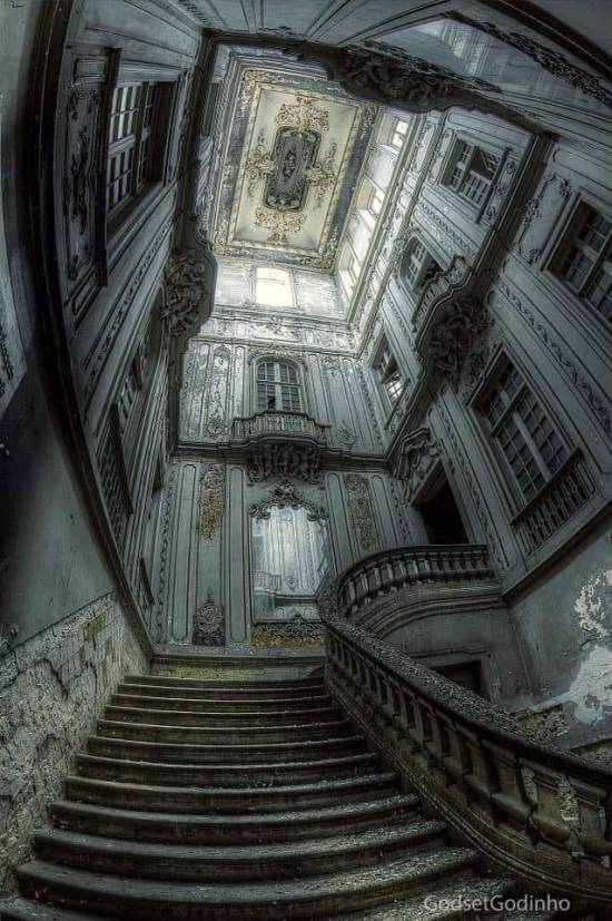 A entrada magnífica do Palácio de Silva Amado, edifício abandonado em Lisboa, Portugal. Construído no início do século XIX, o palácio era famoso por seu interior ricamente decorado com painéis e azulejos. Com o fim da monarquia, o Estado Português comprou o prédio em 1928, mas nunca se preocupou em fazer um projeto de reforma e restauração do lugar. Entrando o século XXI, ele estava em completo abandono e foi então adquirido por uma empresa imobiliária. A prefeitura de Lisboa aprovou a demolição parcial da estrutura para construção de novos blocos de apartamento. Porém, o plano ainda não foi levado adiante. Apesar do Palácio de Silva Amado se manter erguido, muito de sua estrutura original já foi roubada, principalmente as telhas.