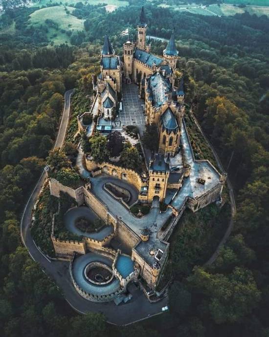 O belíssimo castelo de Hohenzollern, na Alemanha. Sua construção passou por diversas transformações a partir do século XV, até chegar à sua forma definitiva, no século XIX. É propriedade da família dos Hohenzollern, última dinastia de governantes da antiga Prússia e do Primeiro Império Alemão.