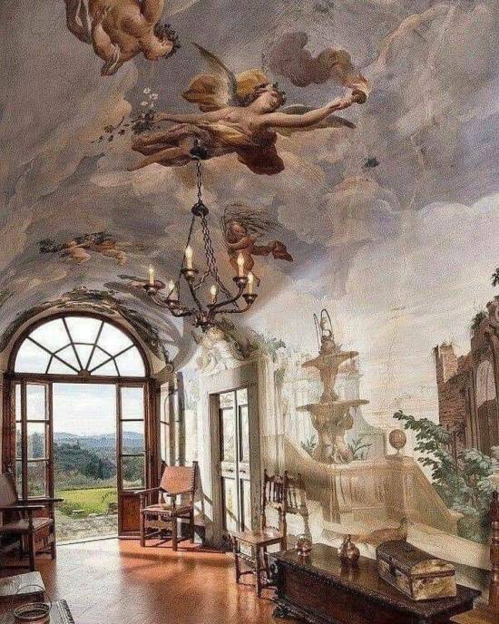 A magnífica entrada do salão da Villa Medicea di Lilliano, localizada a poucos quilômetros do extremo sudeste da Comuna de Florença, na Itália. O Palazzo foi edificado no século XV e em 1646 passou para as mãos de Fernando II de Médici, que o redecorou no melhor estilo do Barroco Italiano.