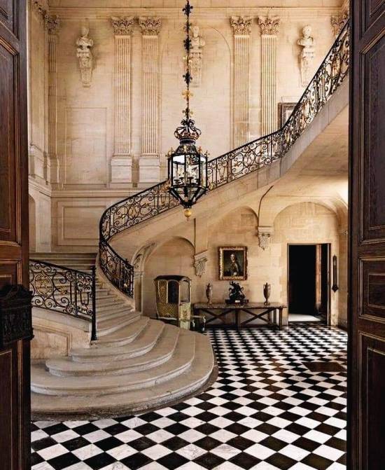 A grande escadaria do salão do Château d’Anet, construído no norte da França por Philibert de l’Orme, entre 1547 e 1552 para Diane de Poitiers, amante titular do rei Henrique II. Nobre francesa de ascendência ilustre, Diane exerceu muito poder durante o reinado de seu amante, servindo-lhe de conselheira até a morte dele, em 1559. Graças a esse relacionamento, sua posição na corte e fortuna cresceram bastante, fomentando a construção de belíssimas mansões como o Château d’Anet, que pode ser considerado um ótimo exemplo da arquitetura renascentista na França.