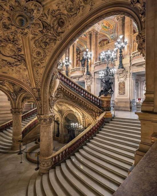 A grande escadaria central do Palais Garnier, sede da Ópera de Paris. Construído em estilo neobarroco, o Palácio foi fundado originalmente em 1669 e reformado durante o Segundo Império Francês, em 1861, sob supervisão do arquiteto Charles Garnier.