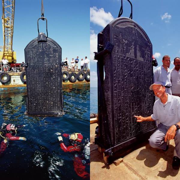 Placa com hieróglifos sendo retirada das profundezas do oceano, em 2015, na antiga cidade perdida de Thonis-Heracleion, que já foi considerada a porta de entrada para o Egito. Na época clássica, Heracleion era o centro das rotas comerciais entre o Egito e a Grécia com o resto do Mediterrâneo. De acordo com a história contada por Heródoto, ela teria sido visitada por Helena de Tróia com seu amante, príncipe Paris. O local foi engolido pelas águas há cerca de 1.200 anos. Mergulhadores da equipe da Universidade de Oxford recuperaram importantes artefatos históricos da cidade, antes localizada na foz do Nilo. Estátuas gigantes de 5 metros foram descobertas e trazidas de volta à superfície, juntamente com outras centenas de estátuas menores representando divindades e antigos. Entre elas, um busto de Cleópatra Evérgeta (ca. 165/160 a.C. – 101 a.C.), mais conhecida como Cleópatra III e outros faraós que governaram durante o Novo Império e o período da antiguidade clássica foram também retirados do fundo do oceano.
