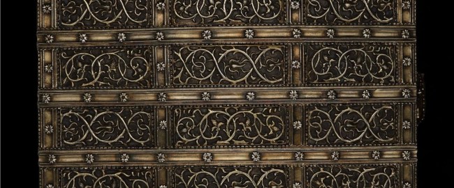 A riqueza de detalhes contidos na tampa do baú. Acredita-se que ele tenha sido confeccionado na França, no início do século XVI.