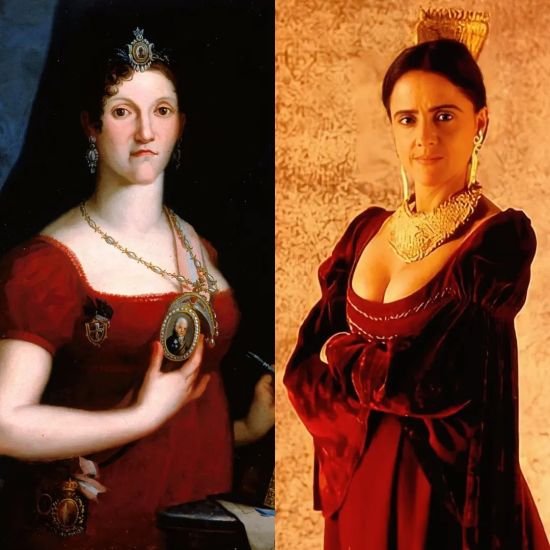 Marieta Severo como a rainha D. Carlota Joaquina, no filme dirigido por Carla Camurati, “Carlota Joaquina, Princesa do Brazil” (1995). Parte sátira, parte alegoria, o filme narra a vida da esposa do rei D. João VI de uma forma bastante controversa, abusando de elementos como sexo, intrigas políticas e comédia, misturadas no enredo para provocar o riso do espectador. Por conta de tais características, muitos historiadores fizeram árduas críticas à produção. Ronaldo Vainfas, por exemplo, disse que o filme “é uma história cheia de erros de todo tipo, deturpações, imprecisões, invenções”, enquanto Luiz Carlos Villalta falou que o longa-metragem “constitui um amplo ataque ao conhecimento histórico”. Com efeito, “Carlota Joaquina” reforçou uma série de estereótipos que vinham sendo desconstruídos pela historiografia há muito tempo, como a imagem de D. João VI como um rei bonachão e de sua esposa como uma rainha devassa. No entanto, em termos de recepção do público, a película foi um sucesso e a atuação de Marieta Severo foi bastante elogiada. Além disso, a obra acabou representando o renascimento do cinema nacional após o fechamento da Embrafilme, empresa que financiava a produção e distribuição de filmes brasileiros.