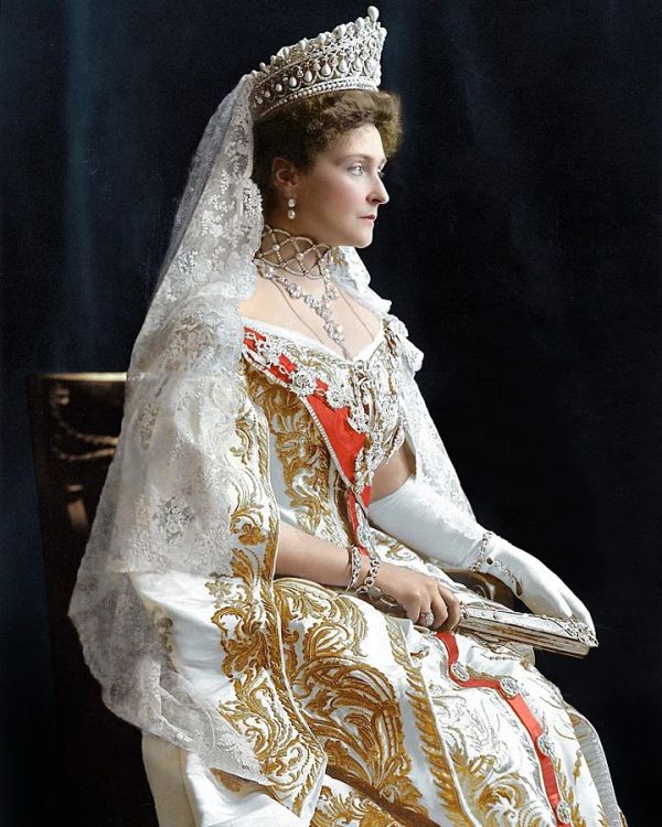 Fotografia digitalmente colorida da czarina Alexandra Feodorovna, em grande hábito da corte russa. A soberana está ricamente paramentada com o Grande Diadema de pérolas e diamantes, colar e gargantilha feita para combinar; atravessando seu busto, uma corrente com várias águias bicéfalas dos Romanov, inteiramente incrustadas de diamantes; nos braços, pulseiras com vários elos e braceletes de ouro e pedras preciosas. Nas mãos, um leque luxuosamente ornamentado. O vestido, por sua vez, é bordado com fios de ouro e apresenta botões de diamantes. As mesmas pedras, só que em tamanho menor, também podem ser vistas na borda da faixa vermelha da Ordem de Santa Catarina. Foto de 1906, colorizada por Klimbim!