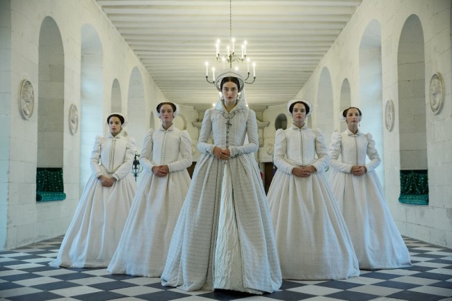 Antonia Clarke como Mary Stuart, acompanhada de seu séquito de damas (as quatro Marys).