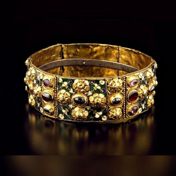 Réplica da coroa do rei Henrique VIII, que costumava ser utilizada pelos monarcas ingleses do século XVI até o reinado de Charles I, exposta no Palácio de Hampton Court. Descrita pela primeira vez durante o reinado de Henrique VIII, inicialmente a peça incluía três figuras de Cristo, uma de São Jorge e outra da Virgem Maria e seu filho. Relatos posteriores à morte do soberano, em 1547, revelam que os três Cristos foram substituídos por três monarcas, entre eles Henrique VI. Segundo Leanda de Lisle, biógrafa do rei Charles I (último monarca a usar a coroa real), é possível que as figuras, assim como as outras peças do conjunto, tenham sido removidas antes da Guerra Civil estourar em 1640. A descoberta recente de uma das peças originais aconteceu nas proximidades do campo da batalha de Naseby, para onde o rei Charles e seus companheiros se viram forçados a fugir depois de terem sido derrotados pelo exercido de Cromwell. Durante a fuga, o monarca abandonou todos os seus objetos e papeis, incluindo itens de valor. Isso explicaria como parte da joias da coroa acabou parando naquela localidade. Em 1646, Charles finalmente se rendeu aos seus inimigos e em 30 de janeiro de 1649 foi executado em Whitehall. Sua coroa (ou o que restou dela – pesando 7 libras e seis onças e avaliada pelo Parlamento em £ 1.100) foi reduzida a moedas e 344 gemas individuais. Segundo informação dos Palácios Históricos Reais, a coroa pode ter sido feita tanto para Henrique VII, fundador da Dinastia Tudor, quanto para seu filho, Henrique VIII, sendo sucessivamente utilizada nas coroações dos outros monarcas da Casa Real: Eduardo VI, Maria I e Elizabeth I. Depois disso, o rei Charles I foi retratado ao lado da peça em 1631, permitindo assim que os especialistas a recriassem de forma “muito precisa”.