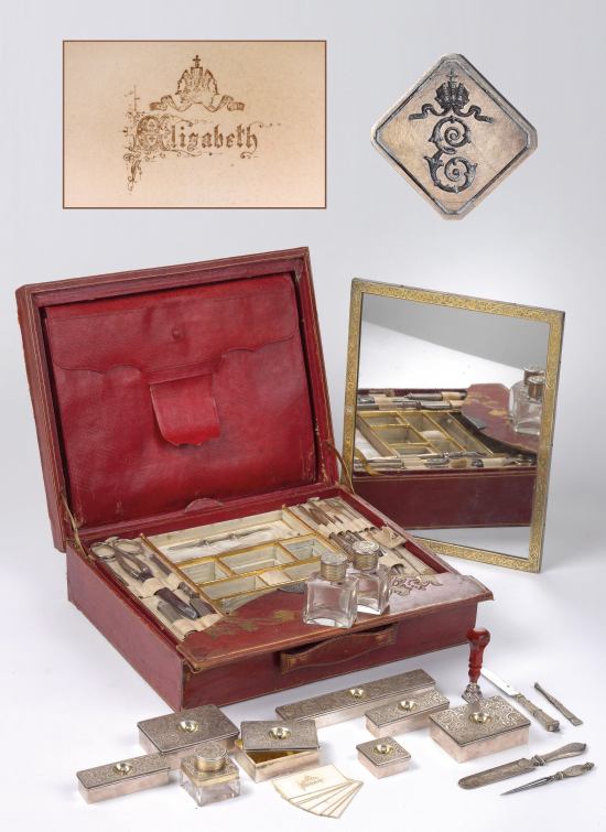 Necessaire de viagem que pertenceu à imperatriz Elisabeth da Áustria, atualmente exposta no Palácio Hofburg. A maleta foi dada de presente a Sissi quando ela tinha 11 anos e ainda era uma princesa bávara.