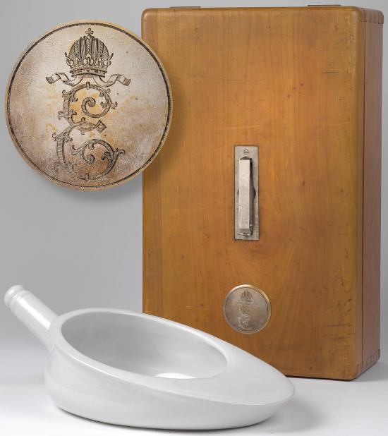 Uma curiosidade a respeito da higiene pessoal feminina nos séculos passados era como as mulheres conseguiam urinar, usando vestidos contendo camadas e camadas de tecido sobre uma armação de crinolina. Talvez esse objeto responda a algumas dúvidas. Sissi sempre carregava essa espécie de urinol portátil consigo nas suas viagens pelos vastos territórios do Império Habsburgo e além. Seu uso era muito prático, uma vez que bastava posicioná-lo entre as pernas por baixo das saias e então se aliviar. Os dejetos podiam ser depois despejados na estrada ou em alguma vala mais recôndita. O urinol da imperatriz Elisabeth, não obstante, apresenta um design bastante sofisticado. Ele foi feito em cerâmica esmaltada e costumava ser mantido dentro desta caixa de madeira, cujo interior é forrado com pele de corça. Na fechadura, podemos ver o monograma da soberana. Apenas a dama da toilette íntima da imperatriz tinha permissão de auxiliá-la nos momentos em que o uso do objeto era necessário, cabendo a ela também se livrar do conteúdo do recipiente.