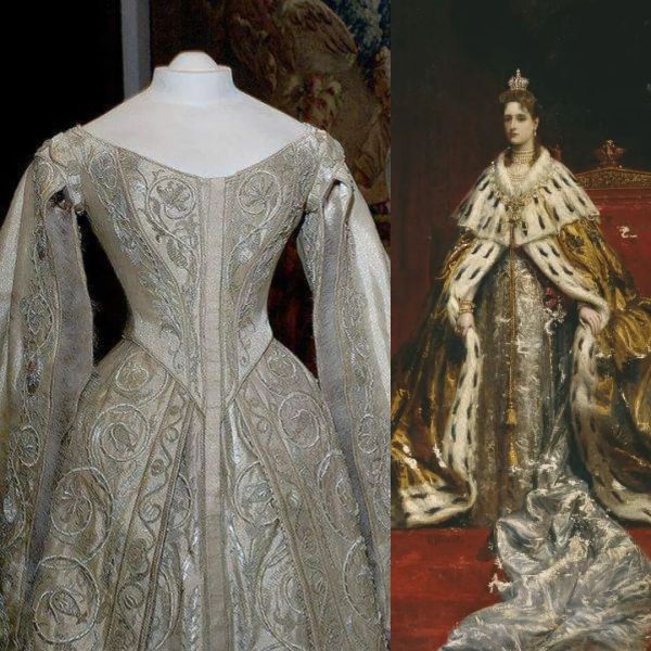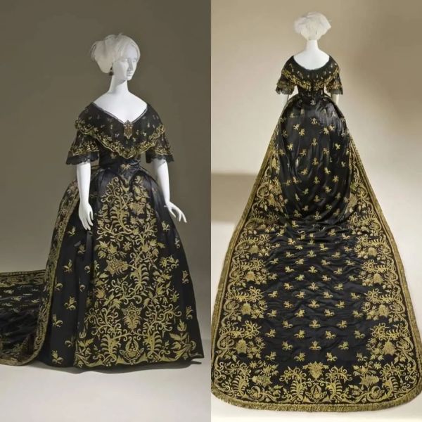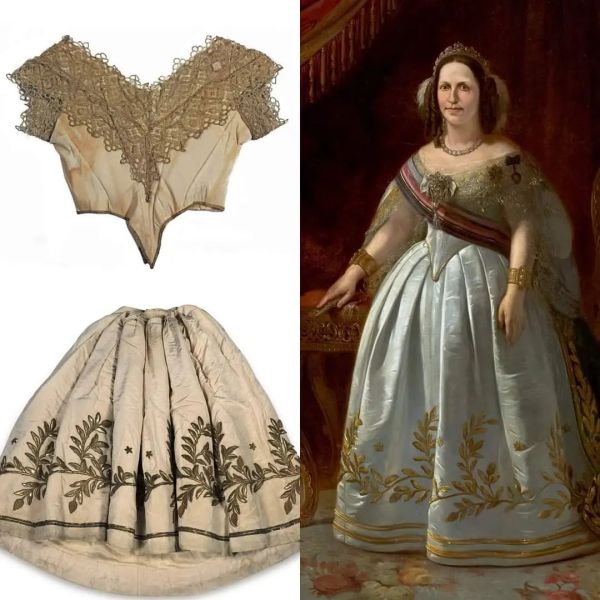 Vestido que supostamente teria pertencido à rainha Dona Maria II de Portugal, primogênita de D. Pedro I do Brasil com a Imperatriz Dona Leopoldina. A peça, confeccionada em cetim escuro com bordado dourado, é datada de 1845. Encontra-se atualmente exposta no County Museum of Art, de Los Angeles (EUA). Embora provavelmente não se trate do traje que D. Maria usou em sua aclamação como rainha de Portugal, a riqueza de detalhes da peça deixa qualquer observador absorvido. Os padrões bordados em linha dourada sobre tecido escuro oferecem ao traje uma beleza ímpar!