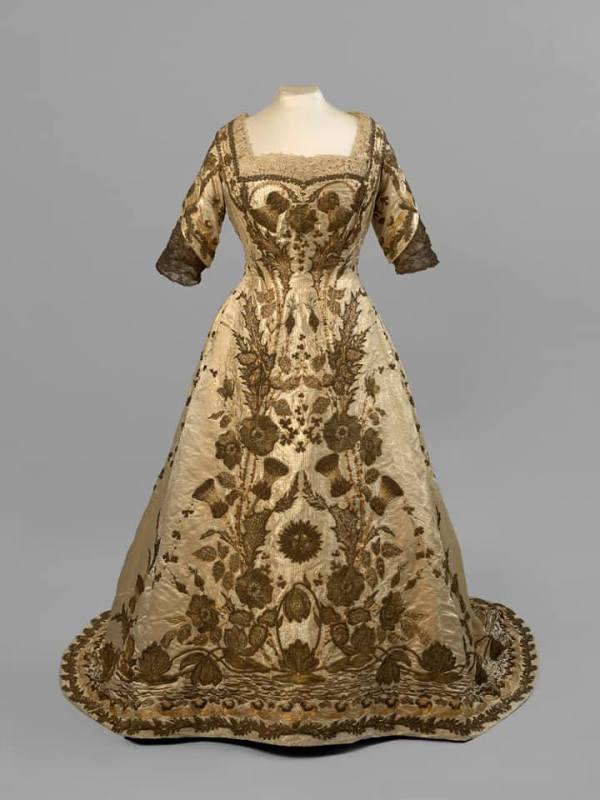 Vestido usado pela rainha Mary de Teck, na coroação do rei George V, em 22 de junho de 1911. O traje, criado pela Reville and Rossiter, uma casa de alta-costura londrina, é composto em cetim de seda creme, com forro próprio, decote quadrado e mangas 3/4 com acabamento em renda e forro de chiffon. A peça é fortemente bordada e frisada por toda parte. O trabalho de bordado com fios de ouro foi feito pela Princess Louise Needlework School (na Sloane Street). É possível observar um padrão com rosas inglesas, o cardo escocês, o trevo irlandês, a estrela da Índia, o lótus da Índia e as folhas e bolotas do carvalho inglês. O vestido também possui um padrão de ondas na bainha, que mergulha nas costas para formar uma cauda.
