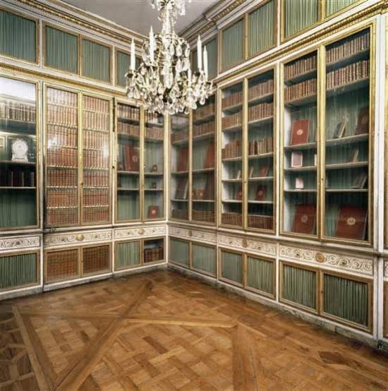 Fotografia da biblioteca pessoal de Maria Antonieta, no Palácio de Versalhes. Todos os livros são encadernados em couro marroquino, com o monograma da rainha na capa.