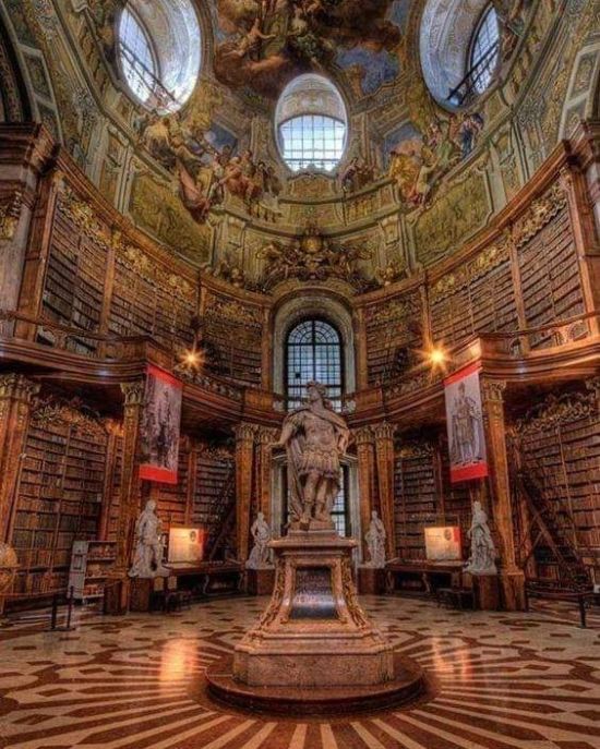 O interior da Biblioteca Nacional da Áustria, em Viena. Sua estrutura foi construída durante a Baixa Idade Média pelos Habsburgo, dentro do Palácio Imperial, o Hofburg. Ao longo dos séculos, ela foi passando por sutis transformações, em sintonia com o estilo arquitetônico em voga. A família imperial austríaca tinha uma verdadeira devoção pela erudição. Os Sacro-Imperadores guardaram em suas residências tudo o que havia de mais recente no mercado de livros, desde manuscritos com iluminuras pintadas a ouro, cujas capas eram decoradas com pedras preciosas, até títulos impressos, graças à invenção de Gutenberg. Esta, por sua vez, possibilitou a difusão do conhecimento ao restante do mundo numa escala nunca antes vista, tornando o livro acessível até mesmo para os extratos mais baixos da sociedade. A família imperial austríaca, por sua vez, patrocinava muitos escritores, cientistas e filósofos, cujas obras acabaram parando nas prateleiras da Biblioteca do Hofburg. Até o ano de 1920, o local costumava ser chamada de Biblioteca do Tribunal de Justiça e sua coleção comporta um acervo de mais de 7,4 milhões de obras, sendo um dos maiores de todo o país.