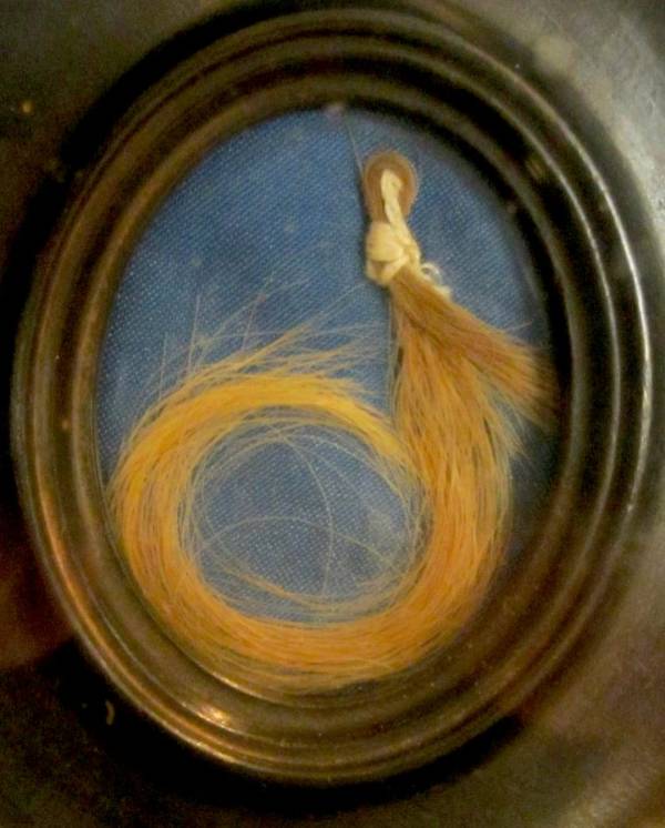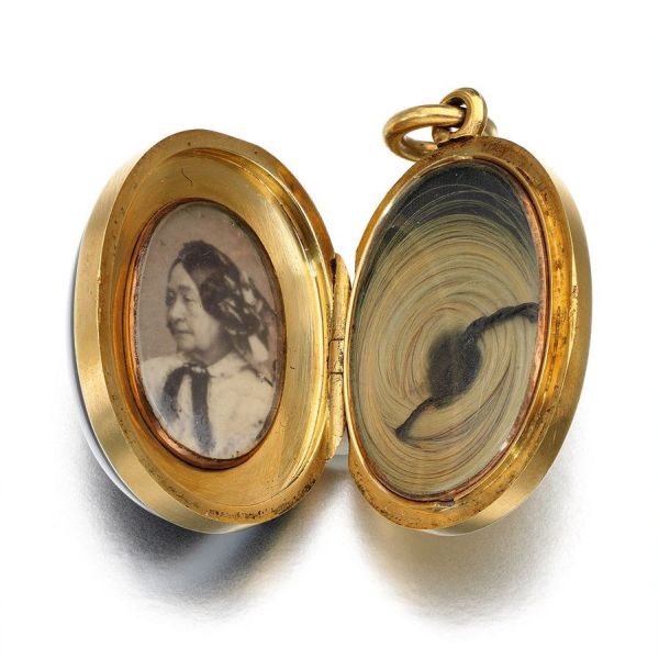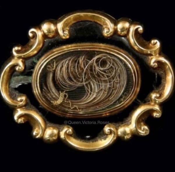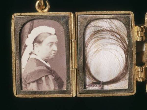A rainha Vitória possuía mementos contendo mechas de cabelo não apenas de seus entes queridos, como também de si própria. O medalhão acima, por exemplo, contém uma cacho dos fios da soberana, ao lado de uma fotografia sua. No outro lado do fecho da joia, se encontra uma mecha com fios do falecido príncipe Albert, ao lado de sua fotografia. Pela imagem da monarca, podemos perceber que a joia de afeto foi confeccionada após a morte de seu marido, uma vez que ela usa suas tradicionais vestes de viúva. O objeto simbolizava a união dos dois para além desta vida, algo em que Vitória acreditava cegamente. Um de seus últimos pedidos antes de morrer foi que alguns desses mementos fossem colocados dentro de seu próprio caixão, em honra daqueles cuja lembrança ela desejava carregar consigo para sempre.