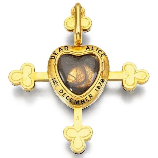 Broche de ouro contendo uma mecha de cabelo da princesa Alice do Reino Unido.