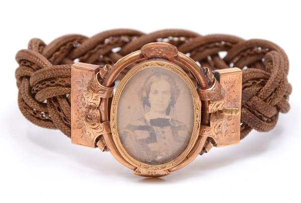 Pulseira trançada com fios de cabelo de sua antiga proprietária, a baronesa do Castelo, cuja foto se encontra no centro da joia.