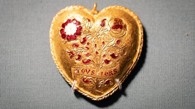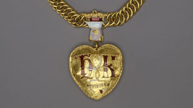 Pingente de ouro em formato de coração, anterior ao ano de 1530, com as iniciais entrelaçadas de Henrique VIII e Catarina de Aragão (Henry e Katherine).