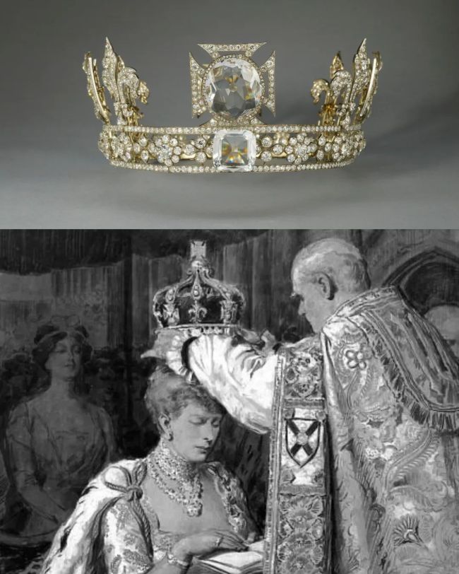 Após a morte da rainha Mary, em 1953, os diamantes principais de sua coroa foram removidos e réplicas de cristal foram adicionadas à moldura. A partir de então, a armação e os diamantes originais remanescentes costumavam ficar em exposição na Sala do Tesouro, na Torre de Londres. A falecida rainha Elizabeth II, por sua vez, costumava usar o Cullinan III e IV em formado de broche. Mas, para a coroação da rainha Camilla, as pedras retornarão para a coroa, só que dessa vez com o Cullinan V substituindo o Koh-i-nûr. As três pedras foram lapidadas a partir do maior diamante bruto já encontrado. De acordo com o site da Royal Collection: