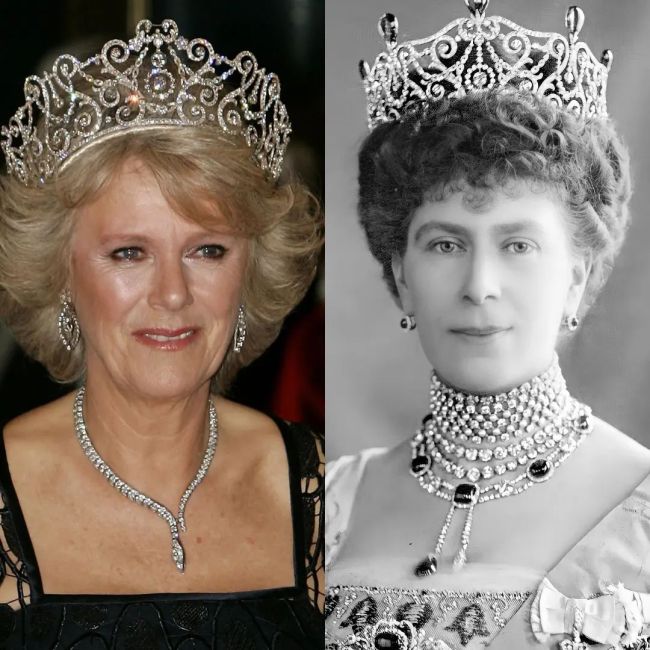 Com efeito, essa não foi a primeira vez que Camilla usou joias que pertenceram à rainha Mary de Teck. Em seu primeiro compromisso oficial como esposa do então príncipe Charles, durante o Banquete de Estado oferecido no Palácio de Buckingham em 2005, ela usou a belíssima Delhi Durbar Tiara. A joia foi confeccionada em 1911 pela Garrard & Co., por ocasião da coroação do rei George V como Imperador da Índia no dia 12 de dezembro do mesmo ano. Os padrões em arabescos são cravejados com vários diamantes, incrustados numa base de ouro branco e platina. Originalmente, 10 esmeraldas cortadas em formato de gota figuravam no topo da joia, para combinar com o colar que a rainha Mary usava. Posteriormente, as esmeraldas foram removidas e a soberana continuou a fazer algumas alterações na peça, removendo também seu arco superior. Em 1947, ela foi presenteada à Elizabeth, a rainha-mãe, que a usou durante a turnê da família real pela África do Sul. A peça passou da esposa do rei George VI para sua filha, a rainha Elizabeth II. Em fevereiro de 2022, a falecida monarca expressara por escrito o desejo de que, quando seu tempo nesta terra chegar ao fim e Charles fosse coroado rei, que Camilla recebesse o tratamento e o título de rainha consorte. Que seja feita então a sua vontade!