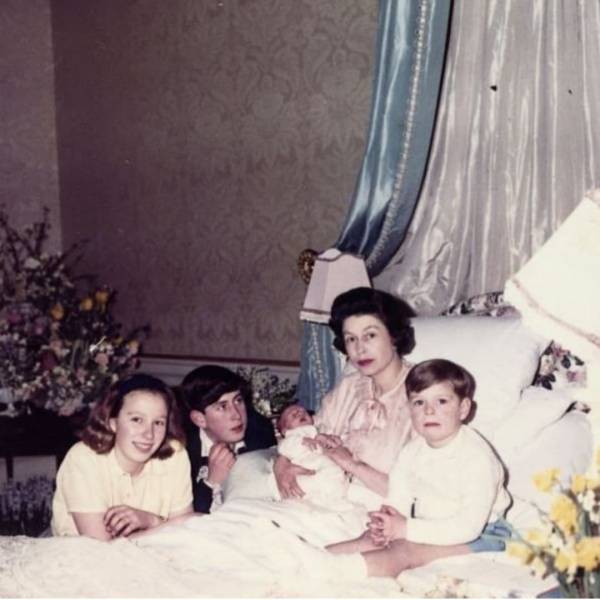 Foto da família real tirada em 1964, com a rainha Elizabeth segurando no colo o recém-nascido príncipe Edward, enquanto está cercada pelos seus filhos mais velhos, Anne e Charles, de um lado, e Andrew do outro.